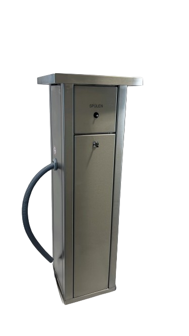 - Gemeinsame Spülung von Entleerungsschacht (150x150mm) und Kassettenbehälter durch DVGW-geprüften Druckspüler mit Spiralschlauchabgang